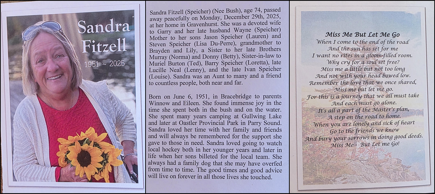 This year, as we packed for the holidays, I had a sinking feeling that 2025 might follow suit. Sadly, on December 29, 2025, Sandra Fitzell (Speicher)—my aunt (married to my dad’s older brother, Wayne) and my godmother—fell ill with a cold, went to bed, and simply did not wake up. She was a humorous, caring lady who loved to fish and was always helping others. She will be greatly missed.