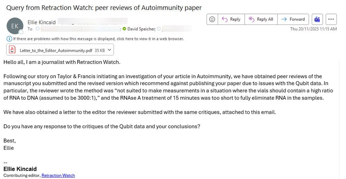 Normally, I am happy to have a good scientific discussion with anyone, anywhere, any time. Still, I do not respond to anyone from the scientific cartel working hard to retract peer-reviewed publications that do not fit their narrative. Especially, Ellie Kincaid, whom I knew was only reaching out to get a comment for an upcoming hit piece. ScienceGuardians has done an amazing job uncovering this peer-reviewed cartel.
